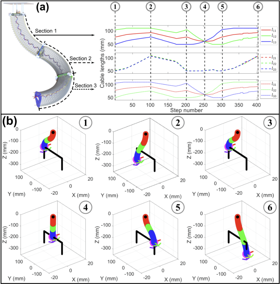 (a) Inverse kinematics solution for the three‐section continuum manipulator executing a pick‐and‐place motion. (b) Snapshot of the robot motion in simulation with the cost function that minimize motion between time steps.1