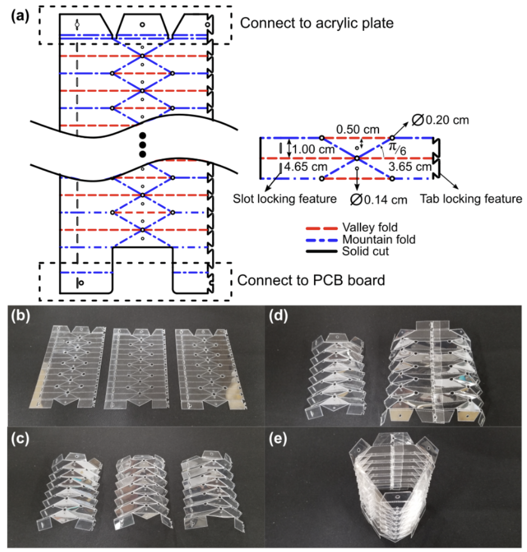(a) Yoshimura crease pattern of the origami module with annotated dimension. (b) Perforated pattern on PET sheet engraved with laser cutter. The speed and power settings for the laser cutter are 100% and 6% respectively. The perforated pattern allows for ease of folding. (c) Folded origami sections required to construct the origami compliant body. (d) Two folded sections combined using the slot‐tab locking feature.(e) Finished compliant origami body constructed from three folded sections.1