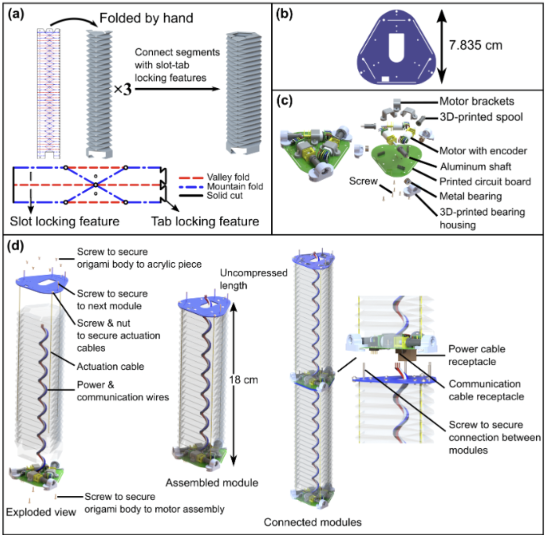 (a) Origami body assembly, (b) acrylic top plate, (c) motor assembly, (d) origami module assembly.1