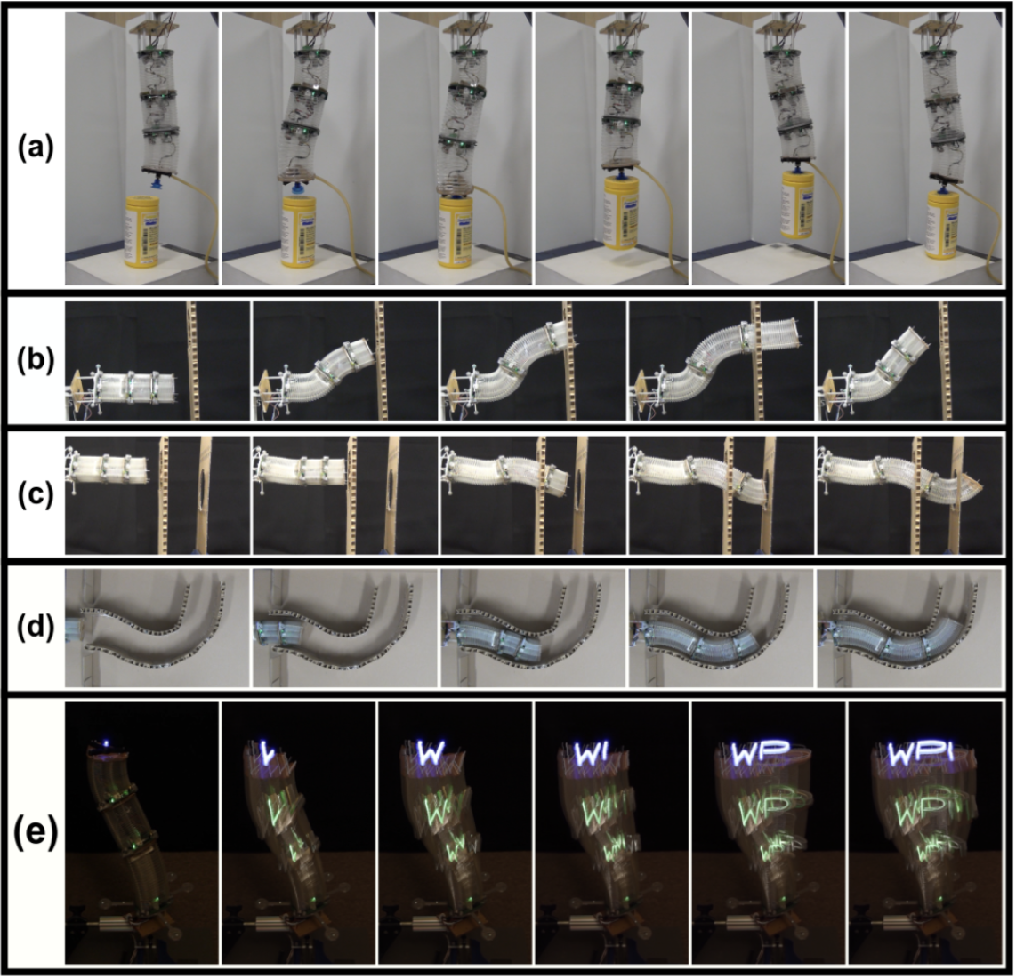 (a) pick‐and‐place, (b) traversing through a mockup wall with a single hole (side view), (c) traversing through walls with two holes (side view), (d) grow‐to‐shape routine with linear slider at the base (top view), (e) end‐effector path following to trace WPI letters. The direction of gravity is all pointing downward except for row d where the gravity direction is pointing into the page.1